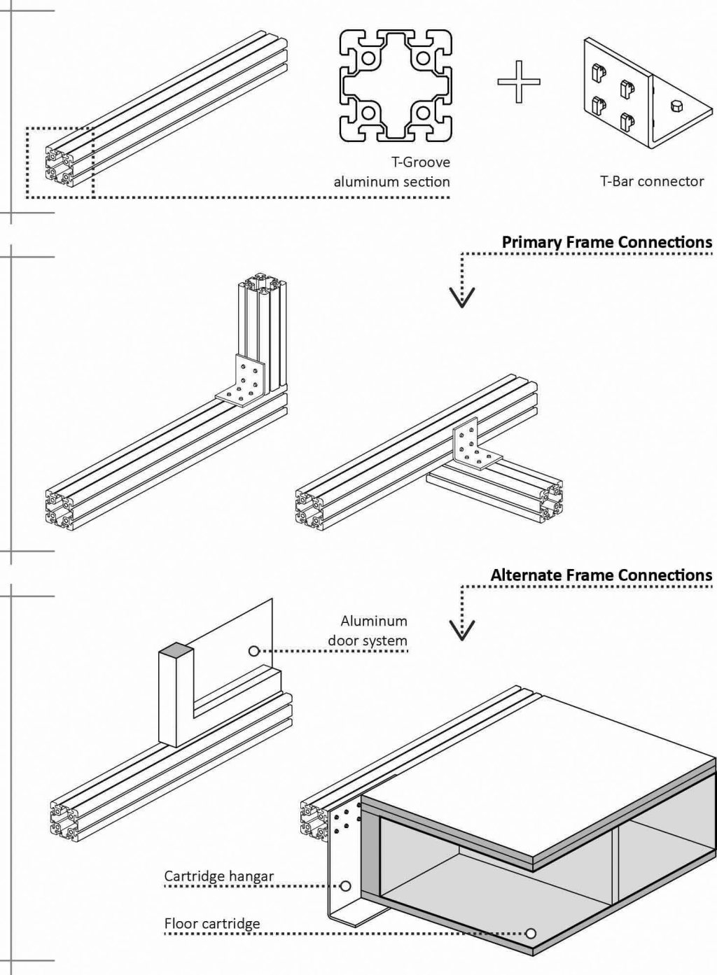 The Loblolly House served as a testing ground for adapting industrial practices to architectural production. This process places significant emphasis on the quality of the joints between materials, components, and systems. As Jean Labatut stated, “It is the precise study and good execution of details which confirm architectural greatness.”[1] In the Loblolly House, the universal joint connecting the tectonic elements serves as a physical realization of the primary objectives of the project. “The source of creativity within the Loblolly scaffold is the simple T-groove, which has been exploited for as many purposes as possible.”[2] This groove is a standard inclusion in the extruded profile used in the project and is integrated into each of the profile’s four sides. Like Semper’s knot, this connection is simple and easy to fabricate, yet it still has the ability to adapt to different situations and needs. And while welding or bolting requires an experienced and skilled team, this system requires only a wrench to fasten together the components.