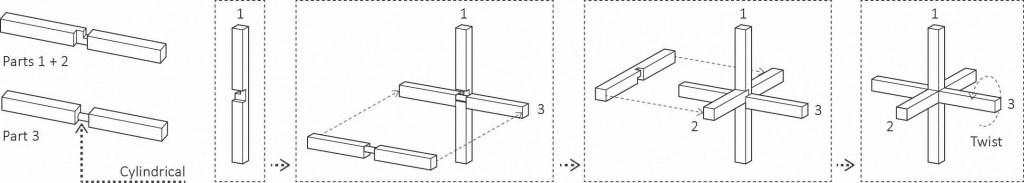 The chidori system used in the GC Prostho Museum required modifications to work at such a large scale. The cross section of the members had to be proportionally increased to ensure structural soundness. Structural testing was performed throughout the process and the result was a final member cross section of 60 x 60 millimeters [2.4 x 2.4 inches]. The increase in scale also required an attention to precision not necessarily required in the fabrication of the toy. Each hand-made piece had to be fashioned precisely to ensure that the structural quality of the joints would be satisfied.