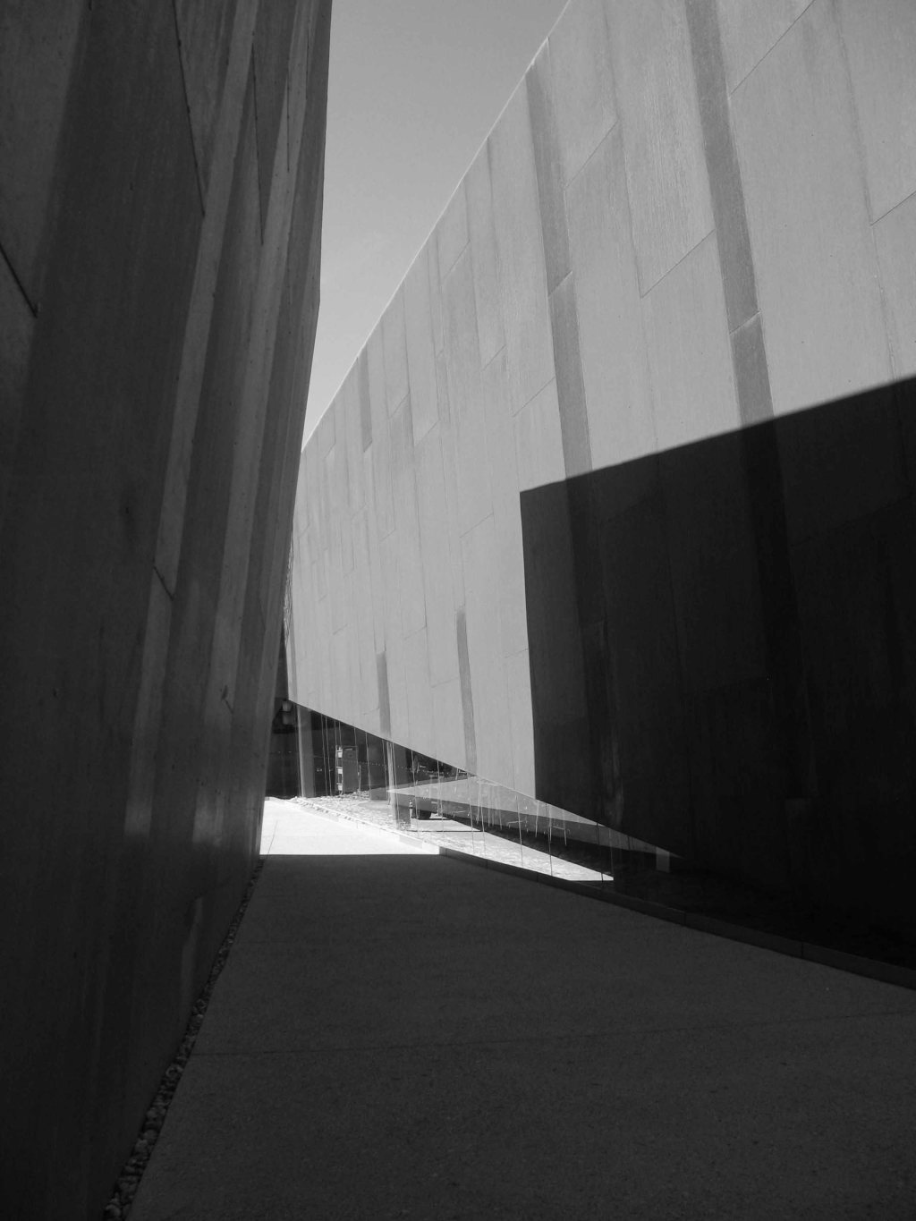 The building is designed with reference to the desert slot canyons of northern Arizona and monument valley. Ever-patient threads of water, sculpting and polishing the massive walls, cut these natural sandstone canyons over millennia. The library echoes this powerful natural sequence. The gesture of the building is complemented by its materiality – rusting steel panels – which provides a similar intensity and tone of color as the canyon walls. Just as the slot canyons have changed (and continue to change) with time, the surface of the steel panels changes as well. This experience is most prominently felt in the entry/exit sequence. This threshold condition – akin to Frascari’s formal joint – succeeds in “capturing the powerful and unique experience between the compressive stone walls and the ultimate release to the sky above.”[1] As time works away on the canyon, the less dense stone is carved away while the denser stone remains.