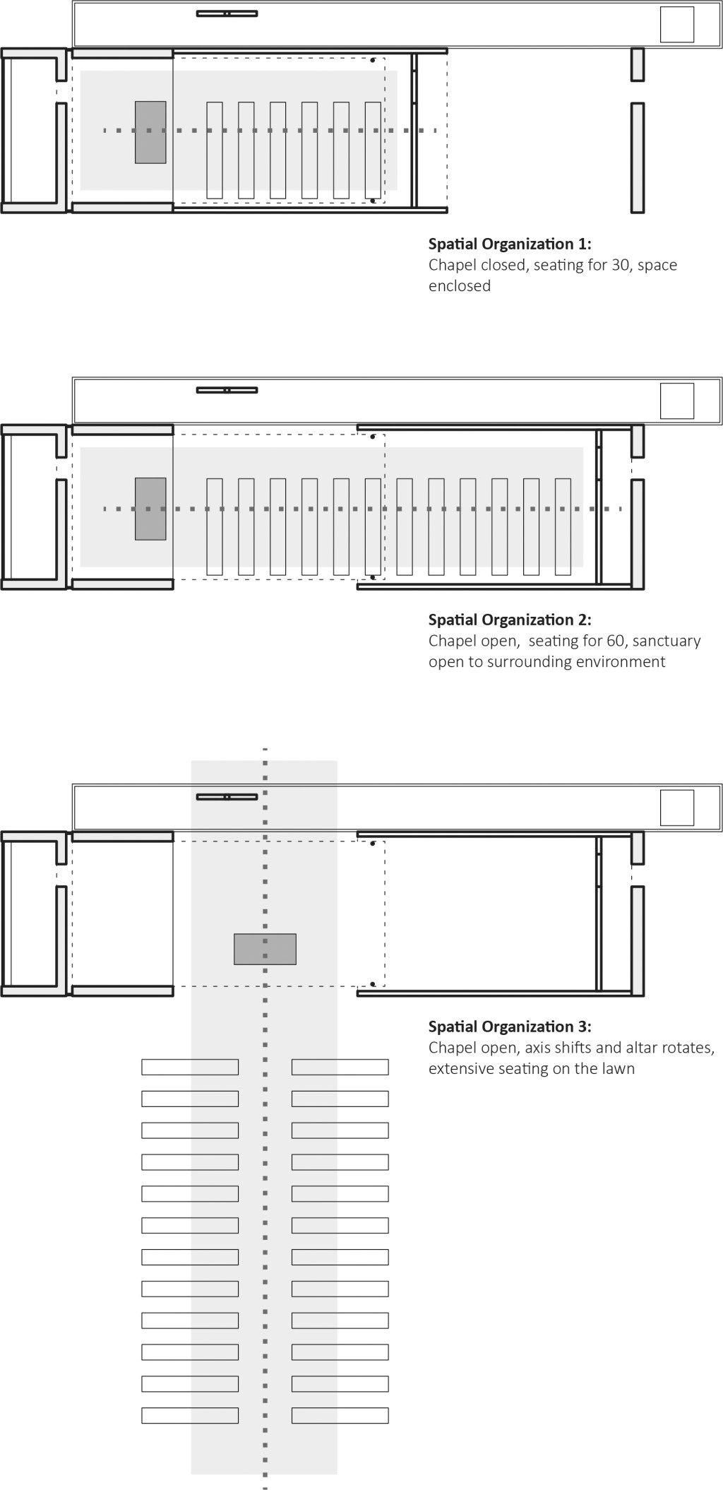 This flexible space allows for three primary configurations. With the volume closed, a small, intimate ceremony or service can be held with about 30 people. With the volume open, larger events can be held in the chapel – up to about 60 people – while also allowing the event to better connect to the lush natural environment. However, a third configuration exists for more substantial events. The entire spatial construct rotates to a north/south alignment with the opening in the volume. In this configuration, the altar moves to the center of the nave, facing south, and the congregation moves to the terraced grassy meadow, which is ideal for seating large crowds.