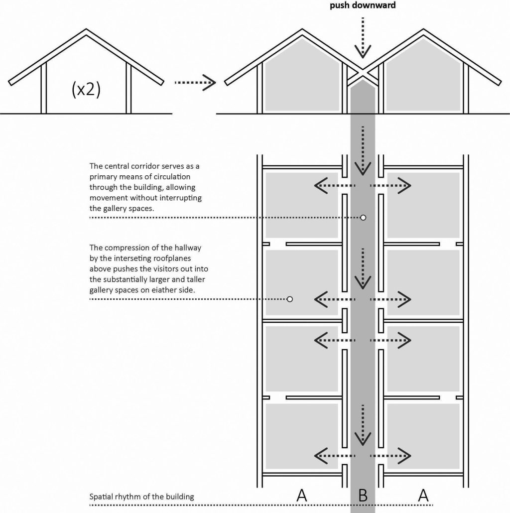 In The Principles of the Hellenic and Germanic Ways of Building, Karl Bӧtticher outlines his theory of spatial tectonics. The primary element of Bӧtticher’s theory is the roof, which is also the dominant component in the development of the space of the Parrish Art Museum. The two pitched roofs define two sets of galleries that run along the north and south sides of the building. The intersection of the roofs in the middle of the building, however, creates a low internal corridor that provides the primary circulation spine through the building. This A-B-A organization is driven by the roof construction and structural scheme and allows the museum to be highly functional with respect to visitor movement through the space.[1] The roof strategy also creates interesting scale relationships in the building. The central hall is low and perceptively pushes downward, urging guests out into the vaulted, almost monumental gallery spaces to either side.