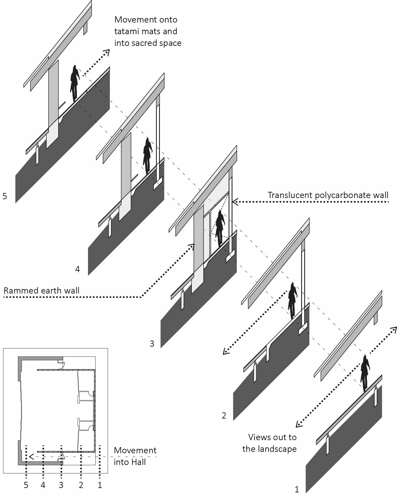 Although not directly connected, the tectonic and stereotomic wall systems of the Foundation Hall meet at the two entries to the building. As you transition from the outside to the inside of the building (and vice versa), you slip between these overlapping layers. This moment is a significant threshold for the project and serves as what Frascari would call a “formal joint” or spatial intersection. From the outside, you walk along the wood deck next to the smooth polycarbonate wall. The first transition is in the flooring, which shifts from wood to a finished concrete slab. You then slip between the polycarbonate and rammed earth walls, eventually stepping through the door. Once inside, your feet are again on wood, but your body is still positioned between the two walls. A bench emerges, attached to the rammed earth wall, which allows you to sit and remove and store your footwear. Finally, prior to entering the main hall, the polycarbonate wall stops and the space opens opposite the rammed earth enclosure into the Hall. This journey is brief, but meaningful both spiritually and experientially and is driven by the material makeup of the space.
