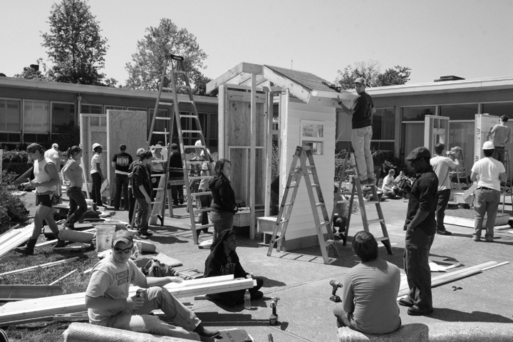 In the spring of 2012, the second year architecture and interior design students participated in a group project for their building technology class. The students were given a simple section and elevation of a single story residence and were asked to generate a 4′-0″ wide construction of the drawing. The process began by translating the given drawing into a full parts list and then into a cost analysis using a local hardware store. The groups next translated the work into a storyboard that describes the entire construction prior virtually. The photos below were taken during the ‘build day’ in which all nine groups of students constructed their work in the courtyard of the architecture building along with a couple pictures of the final product. One of the constructions was built in the adacent gallery space for display purposes for the school.
