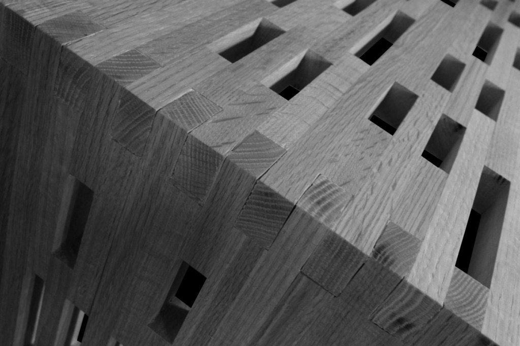 At the conclusion of this semester of ARC351 Design III, this studio of third year architecture students was asked to select a segment of their primary design project – a library for the blind – to investigate in more depth. This section was carefully examined to better understand structure, systems, finishes, and the like. In addition, the students were asked to select one detail or element to build at full scale. Below are two examples of the work generated through this process including the final presentation boards and images of the final built constructions.